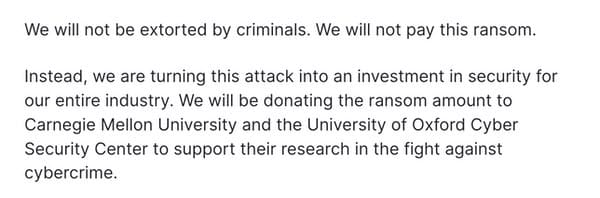 We will not be extorted by criminals. We will not pay this ransom… We will be donating ransom amount to Carnegie Mellon University and the University of Oxford Security Center to support their research in the fight against cybercrime.