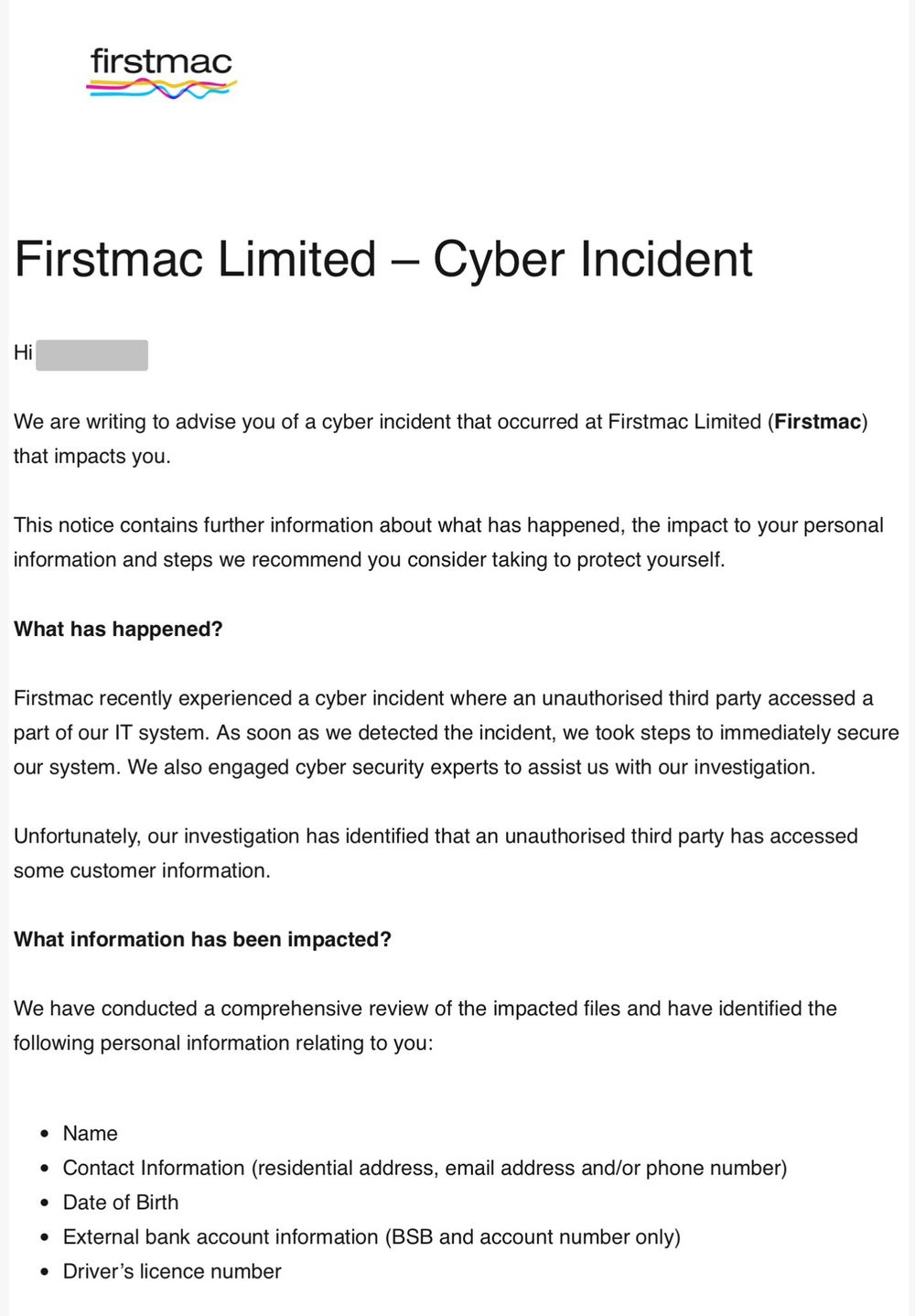 According to a breach notice sent by Firstmac to affected customers and seen by Have I Been Pwned’s Troy Hunt, the company suffered a cybersecurity incident that led to unauthorized access to certain parts of its IT systems.