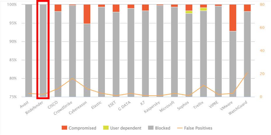 Figure 2: Bitdefender achieved 100% protection while only generating two false-positives.