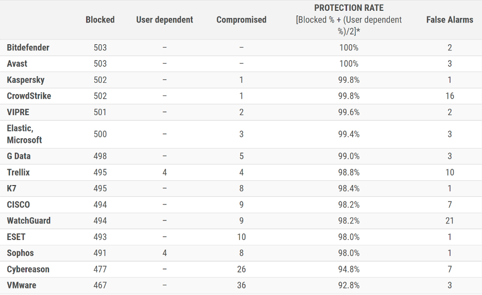 Figure 1: Bitdefender achieved 100% protection with negligible false-positive rate of only 2 out of 503 tests.
