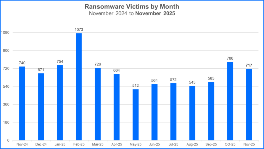 For this month’s report, we analyzed data from November 1 to November 30 and recorded a total of 717 claimed ransomware victims.
