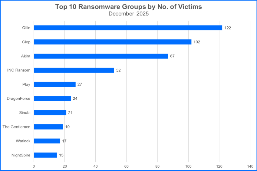 Read More: The Korean Leaks – Analyzing the Hybrid Geopolitical Campaign Targeting South Korean Financial Services With Qilin RaaS - Clop Climbs to Second Place: Clop claimed 102 victims, surpassing Akira and reclaiming a position in the Top 10. The majority of Clop’s victims in the past month have been organizations in the manufacturing, technology, and healthcare industries. The group has repeatedly exploited a zero-day vulnerability to compromise numerous systems. Clop’s attacks have also targeted systems impacted by CVE-2025-61882, which leads to the compromise of Oracle Concurrent Processing. Organizations using Oracle E-Business Suite versions 12.2.14 to 12.2.3 are advised to implement the latest patch to mitigate this flaw.