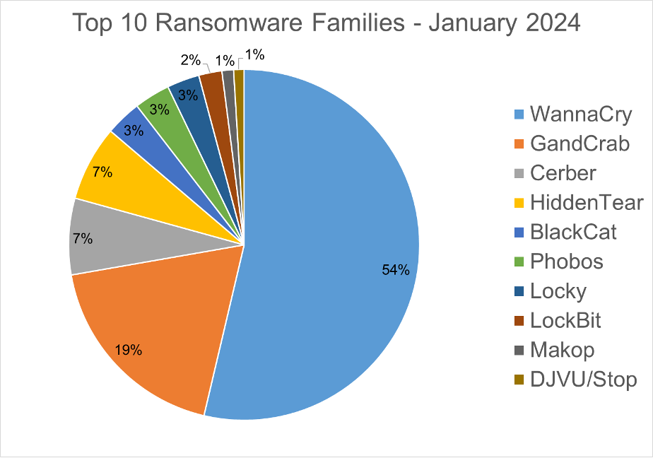 Spear phishing attacks are often used as an initial attack vector and ransomware infection is often the final stage of the kill chain. For this report, we analyzed malware detections collected in December 2024 from our static anti-malware engines. Note: we only count total cases, not how monetarily significant the impact of infection is. Opportunistic adversaries and some Ransomware-as-a-Service (RaaS) groups represent a higher percentage compared to groups that are more selective about their targets since they prefer volume over higher value.