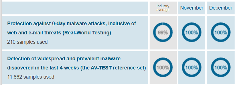 - Detection of Widespread and Prevalent Malware: In this part of the evaluation, AV-Test analyzes how well each solution can protect against 11,862 samples discovered in the last 4 weeks. Once again, Bitdefender achieved a 100% protection score in this category. Combined with our excellent results in the zero-day test, we were able to earn the coveted “Best Protection” award.