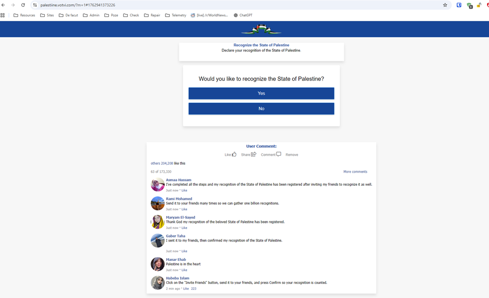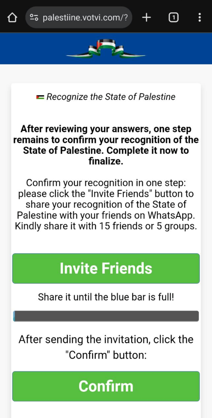 “I recognized the State of Palestine ✋ Tap here and choose Yes to recognize the State of Palestine — don’t ignore it. Go record your recognition; we want as many recognitions as possible: https://vote[.]palestiny[.]com/”