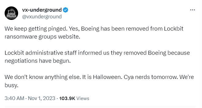 “We keep getting pinged. Yes, Boeing has been removed from Lockbit ransomware groups website,” according to a post on X by the malware platform. “Lockbit administrative staff informed us they removed Boeing because negotiations have begun.”