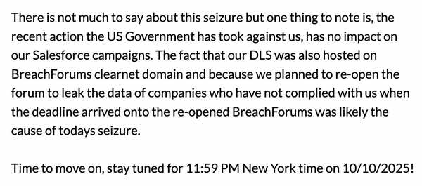 However, the group’s statement went on to claim that the seizure would not impact its threat to leak one billion records belonging to Salesforce customers, scheduled for 23:59 EST tonight, 10 October 2025.