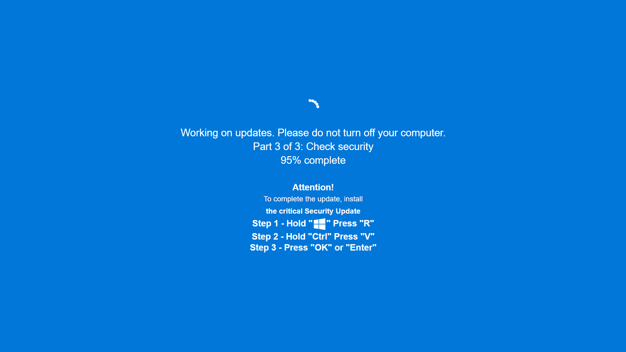 Most ClickFix sites rely on reproducing the CAPTCHA design (a popular tactic), but more innovative approaches include turning your webpage into full-screen mode, pretending to be a Windows Update process.