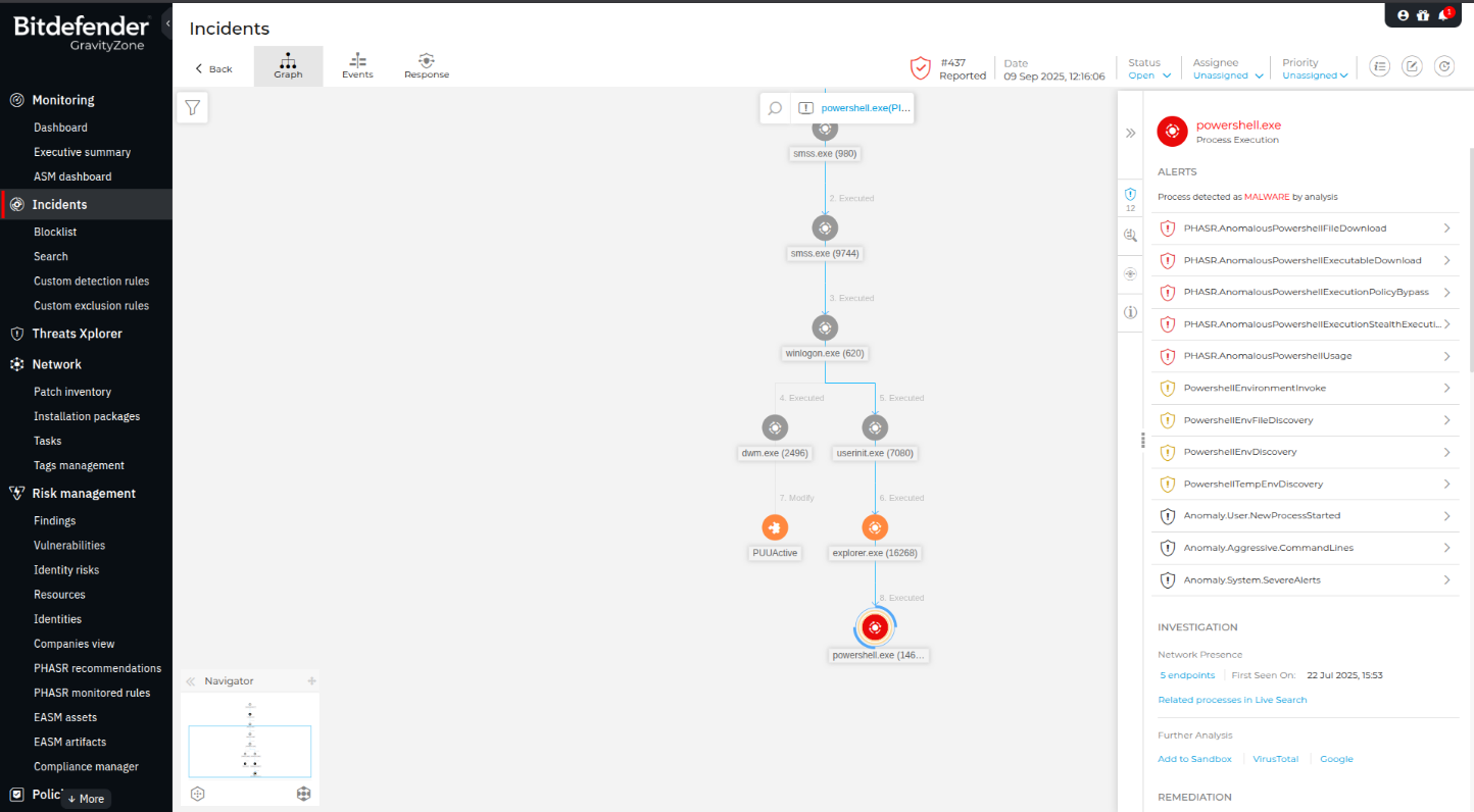 - It flagged the explicit use of the -ep bypass flag (PHASR.AnomalousPowershellExecutionPolicyBypass)