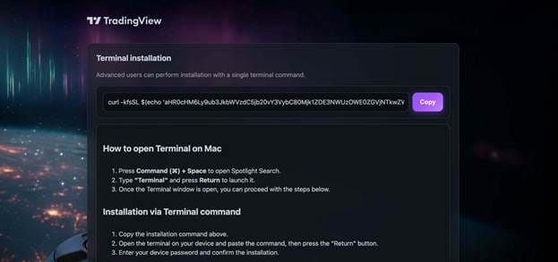 The fake website mimicked TradingView’s interface and offered a “Download for macOS” button. Instead of a legitimate installer, the page presented a Base64-encoded terminal command that, once executed, downloaded and launched a malicious script.