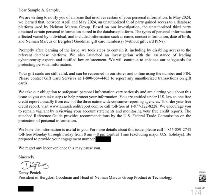 The data notification letter says the type of PII compromised in the breach “varied by individual, and included names, contact info such email address and phone number, date of birth, and Neiman Marcus or Bergdorf Goodman gift card numbers (without PINs).
