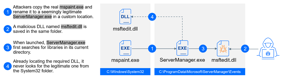 This tactic demonstrates how attackers exploited legitimate software. They identified common programs on victim machines, like the genuine mspaint.exe located in c:\\Windows\\WinSxS\\amd64_microsoft-windows-mspaint_31bf3856ad364e35_10.0.17763.1697_none_db927d8fc072840a. They then copied this executable and renamed it to ServerManager.exe. The key here is the new location. Attackers placed this renamed copy in a directory c:\\ProgramData\\Microsoft\\ServerManager\\Events\\. Alongside this executable, they placed a malicious DLL file (msftedit.dll) in the same directory.
