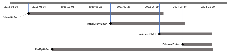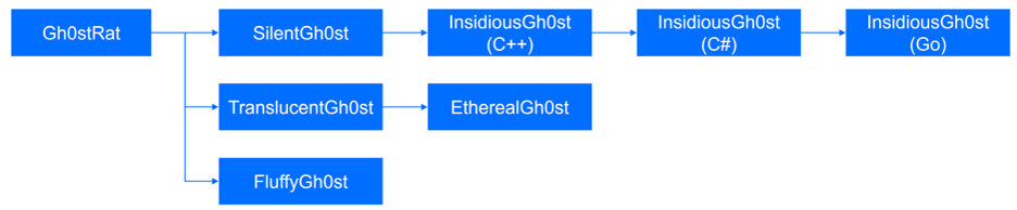 - SilentGh0st, the oldest variant, later evolved into InsidiousGh0st. This evolution involved streamlining functionality, particularly where redundancy existed across modules.