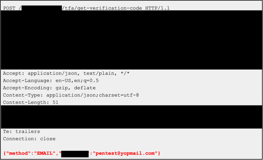 During the test, our tester identified the email field sent during the two-factor authentication process as a vector for account takeover. It was observed during the test that a submitted HTTP request contained an email address parameter (see screenshot below). By design, the email address would be the valid user’s email address. However, the tester observed that changing this email address to his own email address (simulating what an attacker would do) would lead to the application sending the two-factor authentication code to his email address.