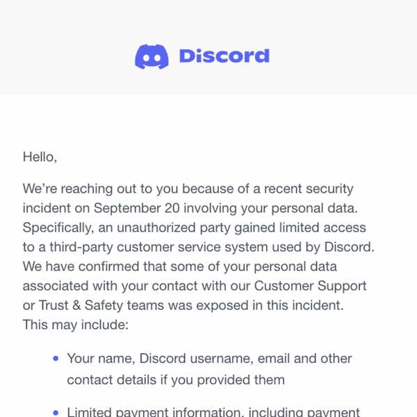 Discord has warned users to be wary of scammers attempting to exploit the data breach, and has underlined that it will not contact affected users about the incident by phone and will only send official communications from [email protected].
