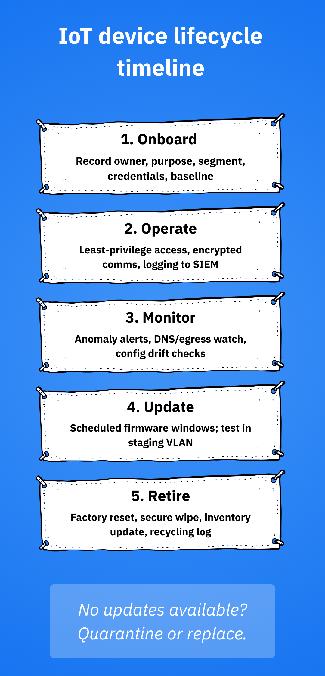- Maintain an owner-tagged IoT inventory with lifecycle metadata