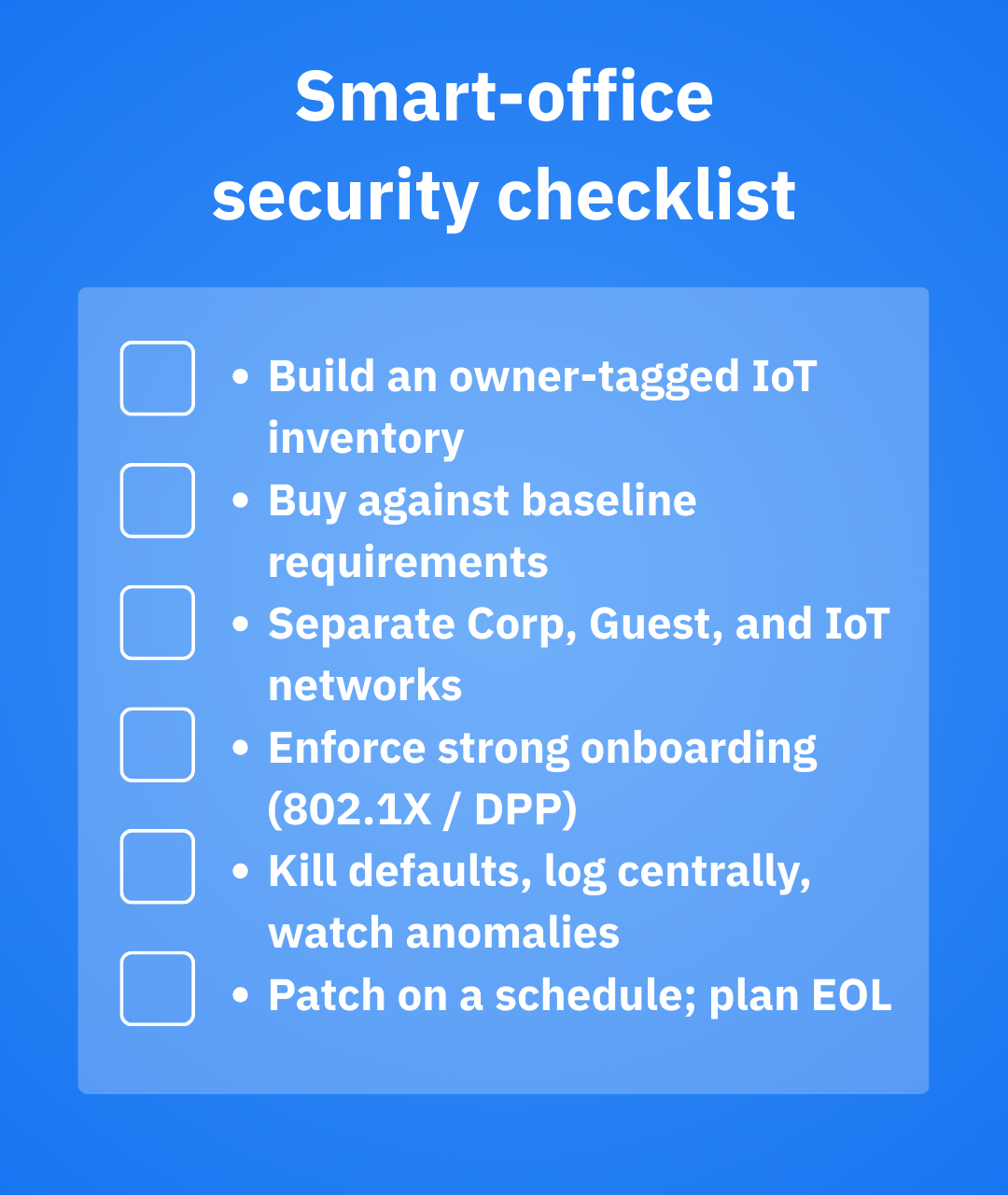 If you do nothing else, make visibility your north star. Buy against recognized baselines, separate what shouldn’t talk, remove defaults, encrypt the pipes and plan for updates and end-of-life from day one. Perfection isn’t the goal – reducing blast radius and catching drift early on is. With a lean, repeatable playbook, you can keep the convenience and innovation of a smart workplace without gambling on its security.