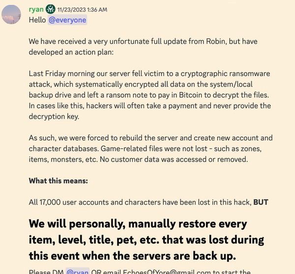 On Thursday last week, the game’s official Discord channel announced that its servers had fallen victim to a ransomware attack that had encrypted data on its systems and local backup, and demanded a cryptocurrency ransom be paid for a decryption key.