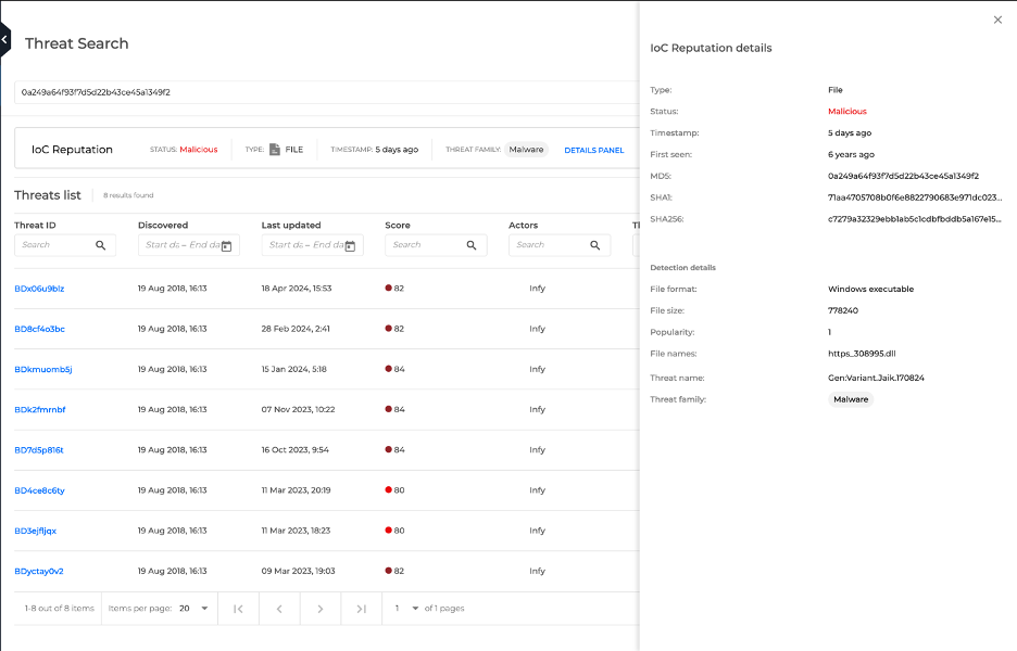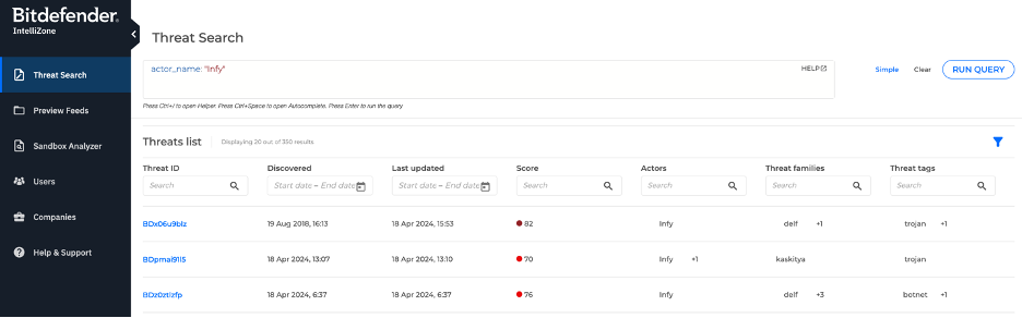 Let’s use Bitdefender as an example, which operates a TI portal called IntelliZone. It’s a one-stop shop for SOC analysts to find actionable insights on threats, threat actors, or TTPs. IntelliZone users can, for example, submit a file hash they’re investigating, and get a detailed breakdown of the threat, associated actor, and other relevant details.