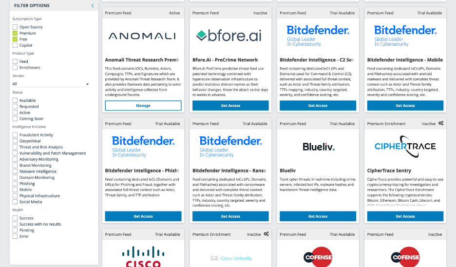 A threat intelligence platform usually has a large marketplace that offers threat intelligence from multiple vendors. It funnels this TI to customers via a unified data model, in automated or manual ways, in a periodical manner (typically from every-6h to once-per-day). Here’s an example of feeds available to license on Anomali’s marketplace: