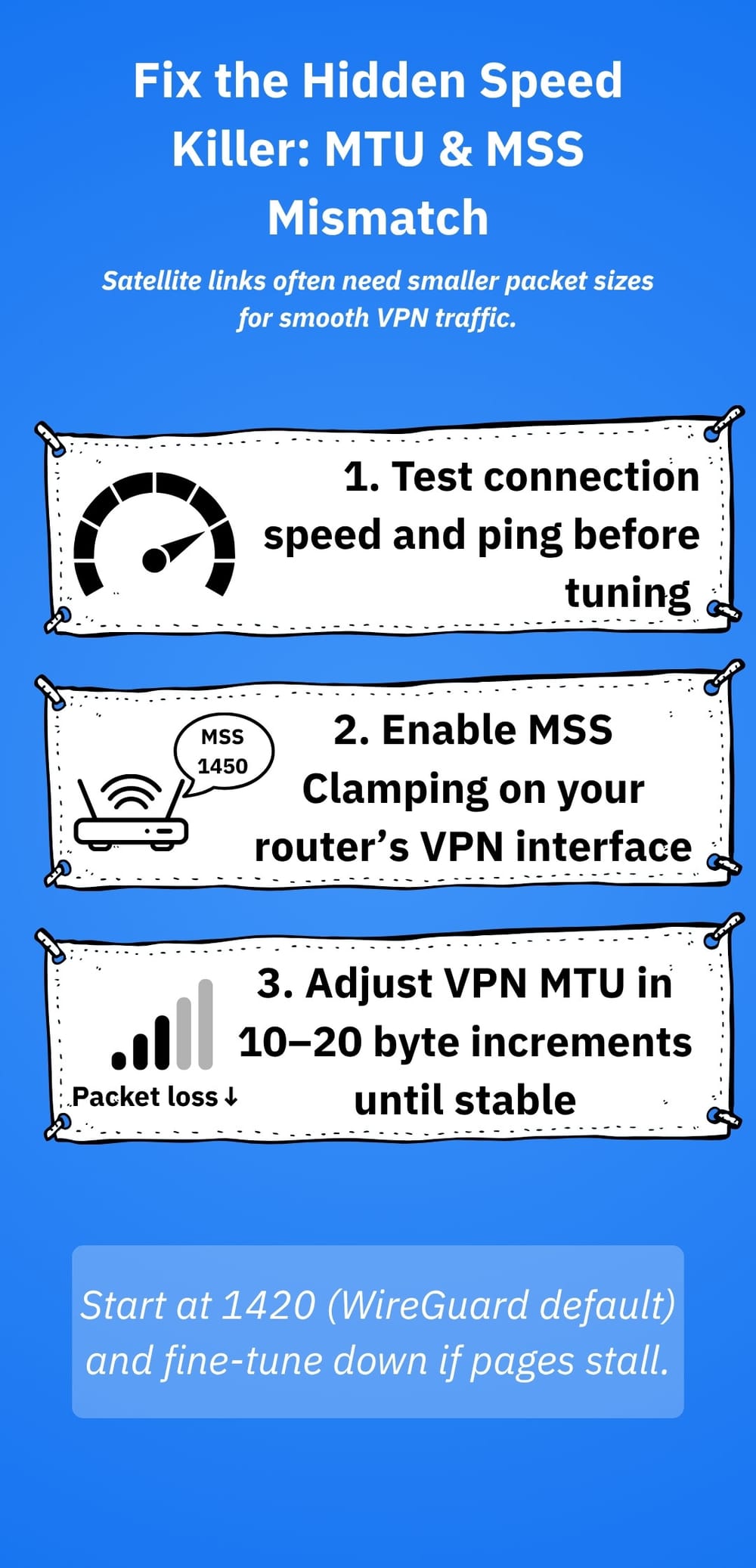 Encrypted tunnels add overhead. If packets exceed the path MTU they fragment or stall, causing slow pages and mysterious timeouts, especially noticeable over high-variance satellite paths. Set MSS clamping on the router’s VPN interface and, if needed, reduce the VPN MTU (common WireGuard defaults ~1420, OpenVPN often ~1500 minus overhead). Test and adjust in 10-20 byte steps until retransmits drop.