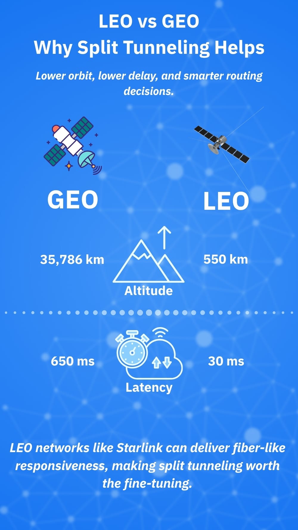 Why this setup: LEO latency varies by geography and time of day, but is routinely far lower than GEO. Independent measurements from Australia’s regulator found an average latency of ~30 ms for LEO vs ~665 ms for GEO, which aligns with broader observations from the Internet Society’s global tests. That means a well-tuned split tunnel can feel “local” for most browsing, while still protecting sensitive flows.