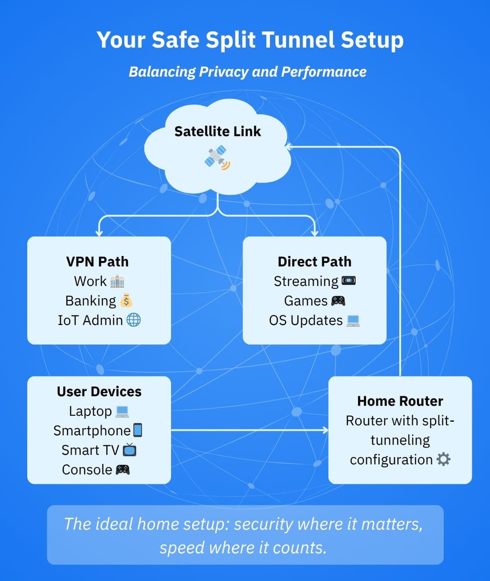 Split tunneling over satellite works well when you treat it like a security policy and not a speed hack. LEO links make “direct” traffic feel local, while sensitive flows stay protected in the tunnel.