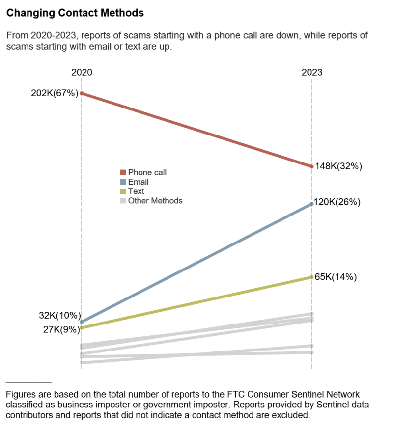 Looking at the same three-year time span, FTC analysts noticed that reports of scams starting with a phone call have plummeted, while reports of scams starting with a text or email have increased.