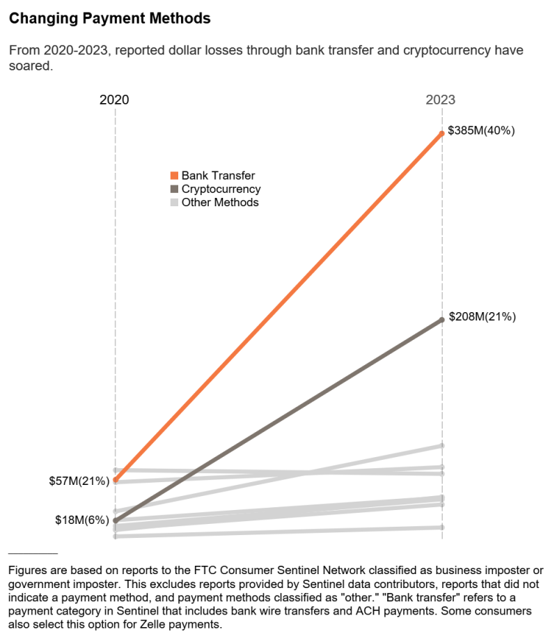 In that same period, reports of losses through bank transfer and cryptocurrency skyrocketed, the agency says, adding the line between business and government impersonation scams is blurring.