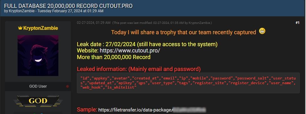 Unauthorized access to Cutout.Pro’s userbase data was disclosed last week on the all-too-familiar BreachForums by a threat actor using the handle ‘KryptonZambie.’