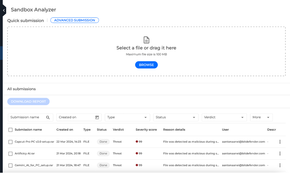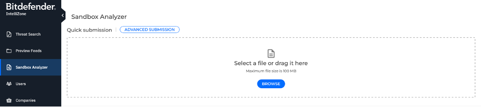 For example, Bitdefender lets users access its sandbox service via API, or the IntelliZone platform. There, you can submit URLs and files for sandboxing.