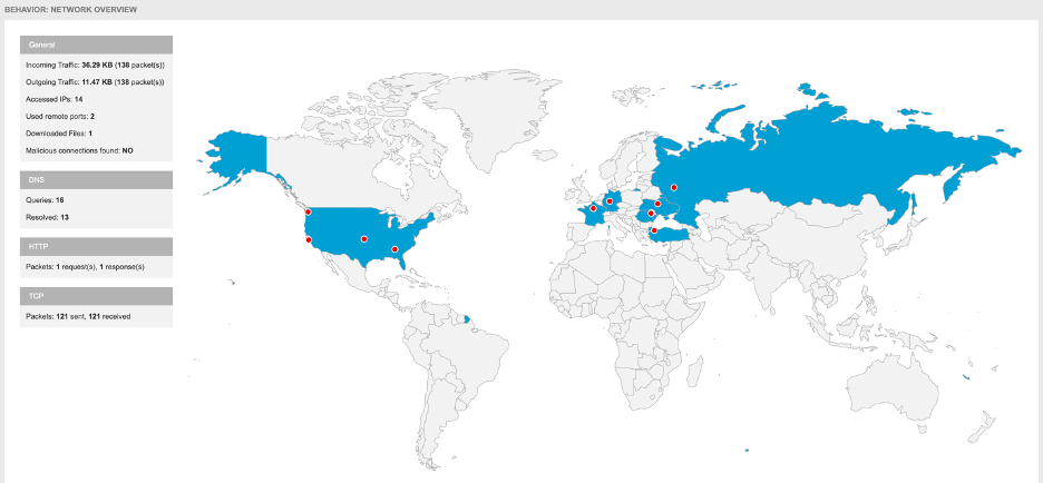 And a lot of other summaries, like a list of system changes, MITRE ATT&CK framework references, and even a geographic breakdown of a file’s network activity: