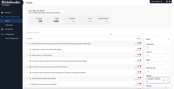 Bitdefender GravityZone CSPM+ Rules security findings.