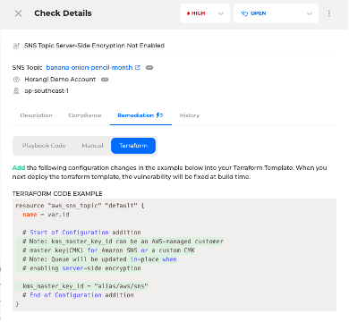 Terraform Code Example uses a configuration language for managing infrastructure. By tailoring the configuration in the provided example and deploying the template again, the administrator can fix the identified findings.