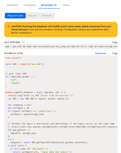 In Playbook Code, the administrator is provided nodejs javascript code written by us and automatically generated by the platform. The code can be reviewed by the administrator, and after logging in to the cloud security provider with sufficient permissions, the administrator can simply copy the code from Bitdefender GravityZone CSPM+ and paste it into the cloud CLI to fix the findings.
