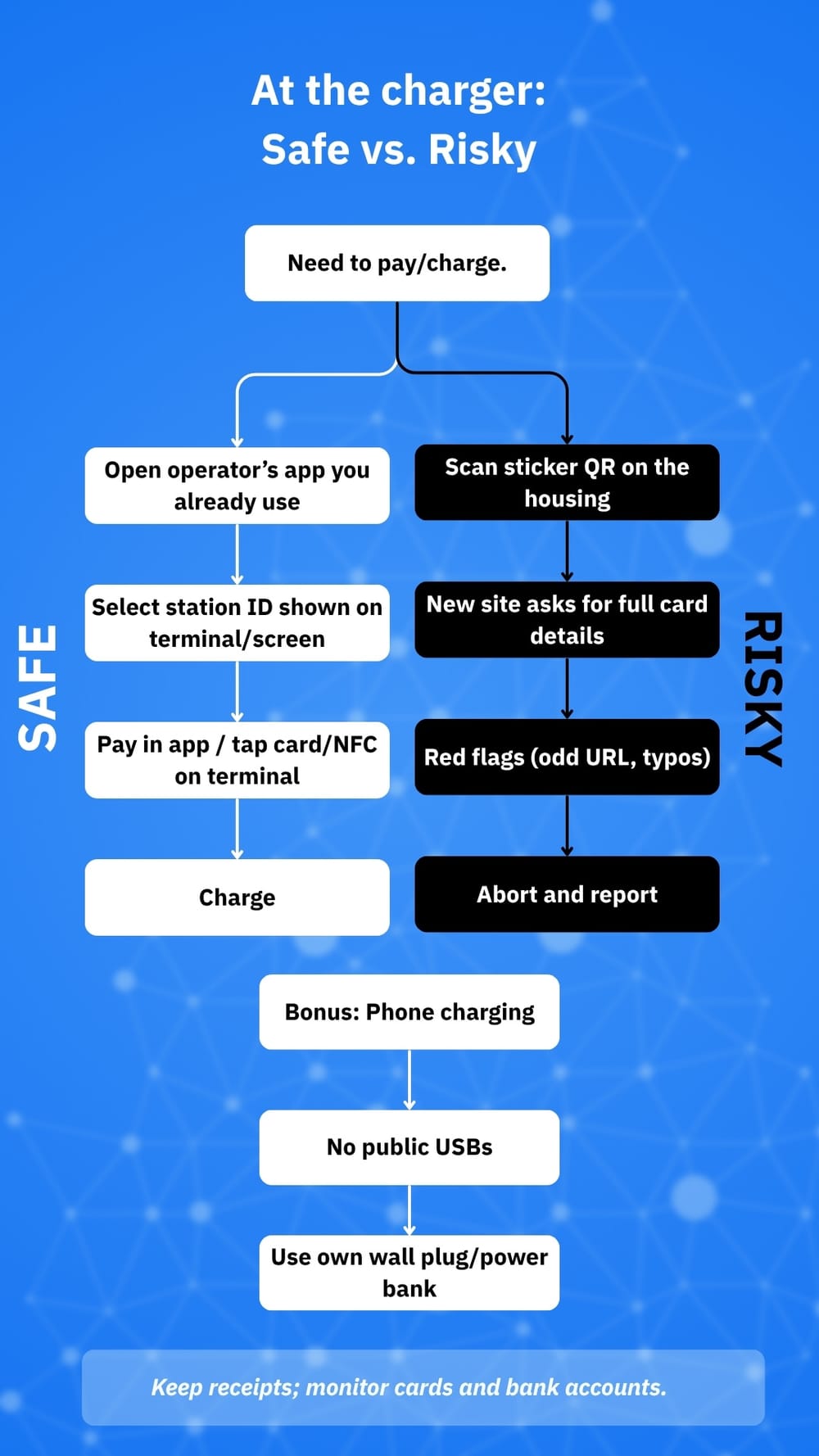 - “Public chargers will hack my car.” Reality: consumer-grade attacks usually target your phone or payment, not deep in-car systems. Charger/backend hacks do exist in research and occasionally in the wild, but they’re far more rate than QR scams or skimming.