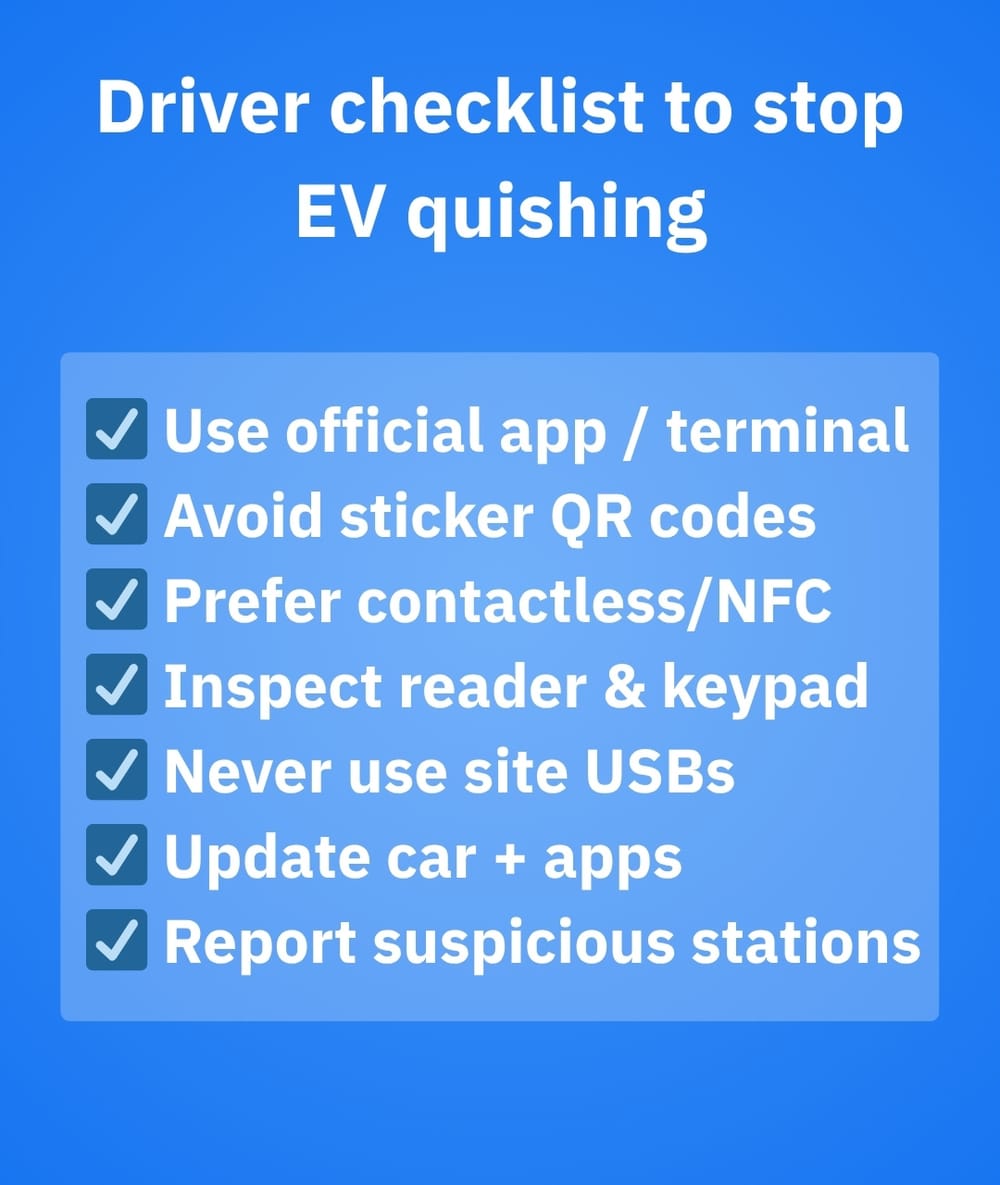- EV “juice jacking,” modern flavor: Perpetrators hitch a ride on the EV charging experience, usually with fake QR codes (quishing) that send you to bogus payment sites. Sometimes, they probe charger networks and backends for security gaps.