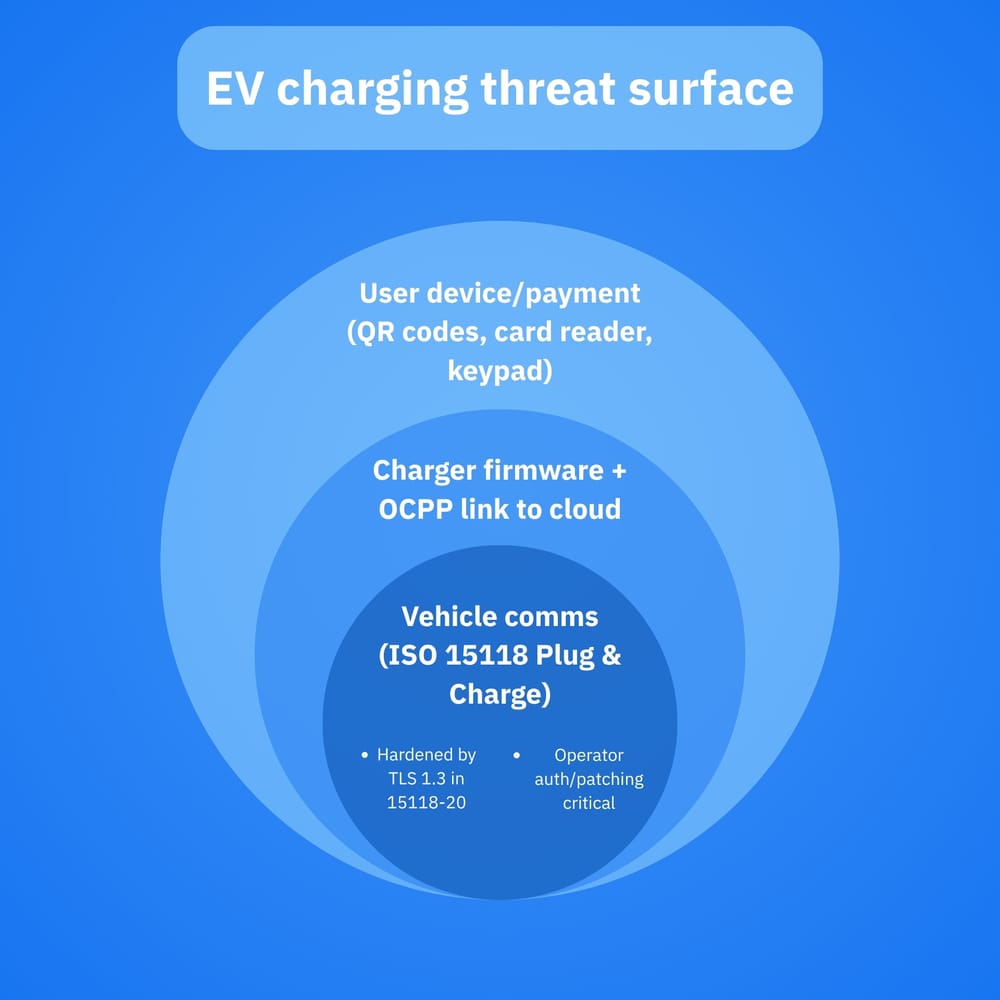 Charging networks rely on standards like the OCPP (charger <-> cloud) and ISO 15118 “Plug & Charge” (car <-> charger). Studies have documented risks: weak auth on some OCPP deployments and earlier ISO 15118 variants that allowed unencrypted sessions in certain scenarios (fixed in ISO 15118-20 with mandatory TLS 1.3). Practical car-hacking from a public charger is still a high-skill, low-frequency scenario, but the research tracks show why operators must harden systems.