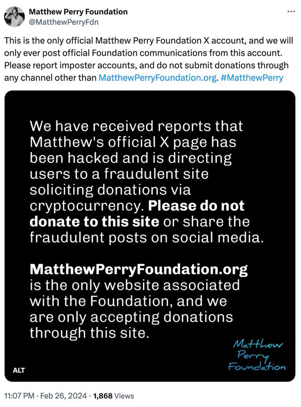 However, in a tweet, the official Matthew Perry Foundation warned that the post was bogus and told followers not to share the fraudulent plea via social media, and reminded them to only donate via the official site at matthewperryfoundation.org.