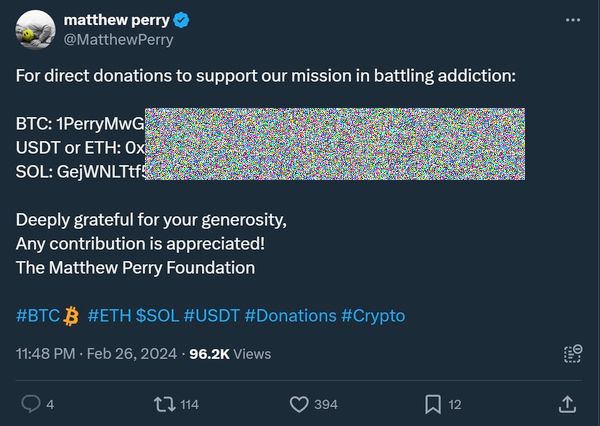 The post, which has since been removed from Perry’s Twitter account, asked for cryptocurrency donations “to support our mission in battling addiction.”