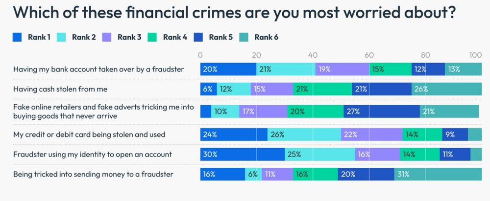 “Fraud resulting from stolen cards and identity theft leading to application fraud were the most likely to feature in their top three most concerning fraud types,” FICO’s report reads. “Given the headlines about people losing large sums to scams, it’s notable that they are significantly less worried about being tricked into sending money to a fraudster.”
