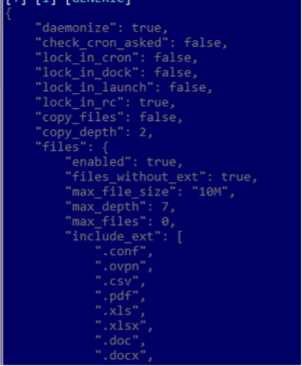 Some configurations also include specific instructions about what data to collect, such as the maximum size and maximum number of files, as well as lists of targeted extensions and directories, or directories to exclude