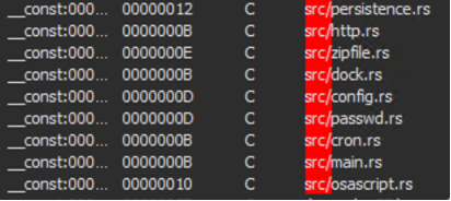 The files’ source code is written in Rust, and analysis of the binaries reveals the names of the original source files. Rust’s syntax and semantics differ from those of more common languages like C or Python, making it harder for security researchers to analyze and detect malicious code. This can give malware authors an advantage in evading detection and analysis.