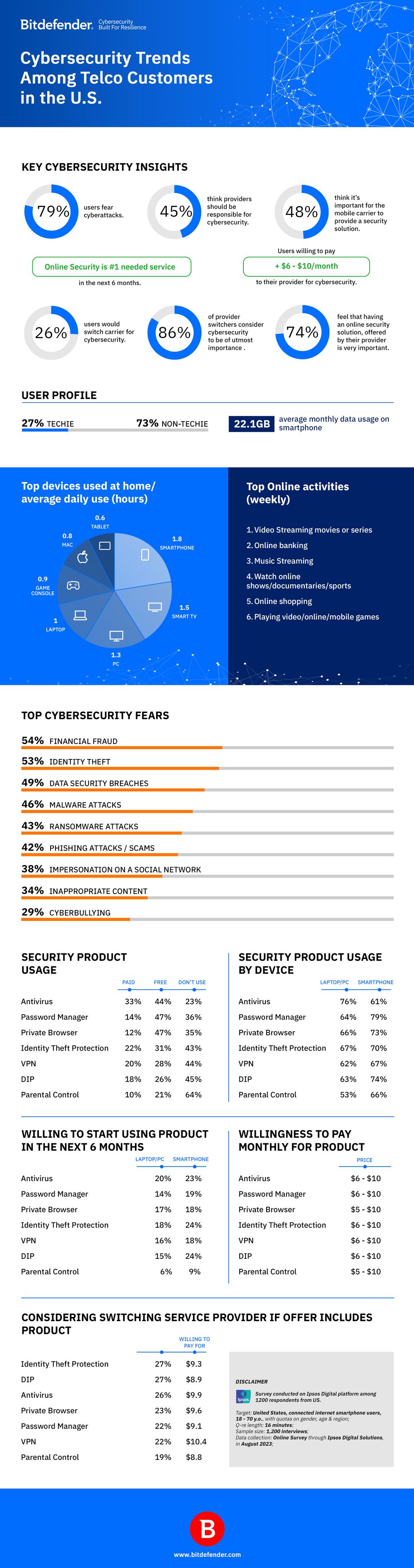 According to a recent user behavior study conducted in the United States by Bitdefender and Ipsos, cyberthreats remain a hot topic on every digital user’s mind, with 79% of those polled expressing fear of cyberattacks. The greatest concern appears to be identity theft, with 53% of participants concerned about their digital identity and 49% concerned about losing personal information due to data breaches.
