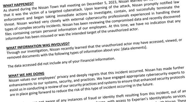 Unfortunately, Nissan now finds itself in the embarrassing position of having to warn workers that sensitive personal information was accessed by the hackers – including the names and social security numbers of over 53,000 current and former employees.
