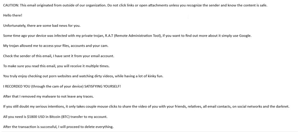 The underlying message is simple, and criminals don’t mince words. They had malware installed on your device, phone or computer (they don’t specify), and they recorded you in a compromising posture. They threaten to release the recordings only if they don’t receive a payment, usually in Bitcoin.