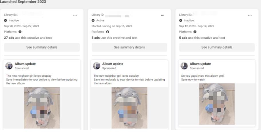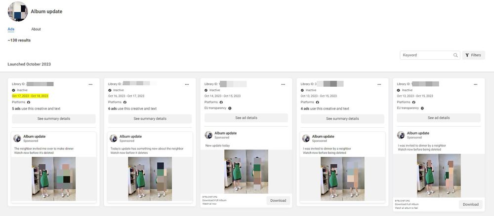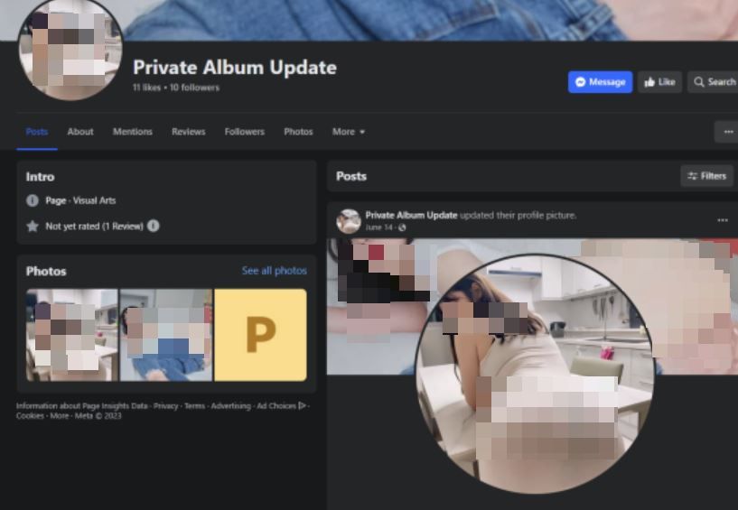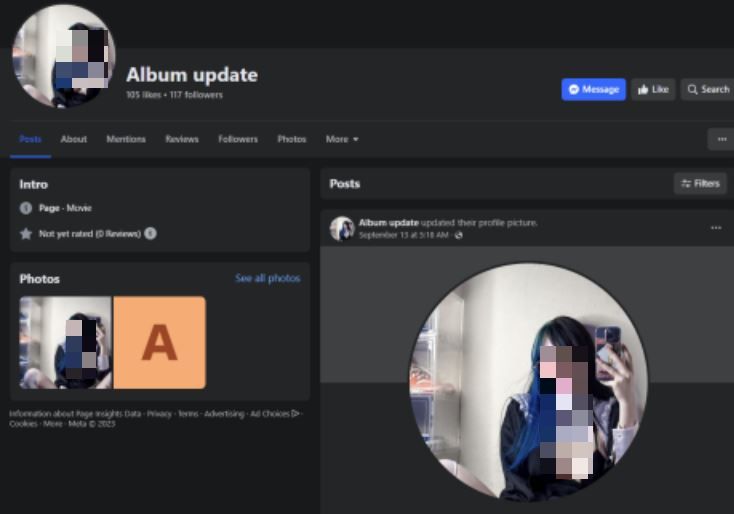 After the page is set up, malicious actors begin running ads that promote fake new content and entice users with lewd album covers. Some of the photos advertised appear to have been edited or even AI-generated.