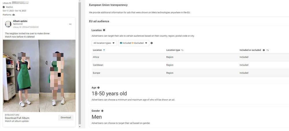 Meta’s Ads Manager tool is actively exploited in these campaigns to target male users on Facebook, aged 18 to 65 from Europe, Africa and the Caribbean.