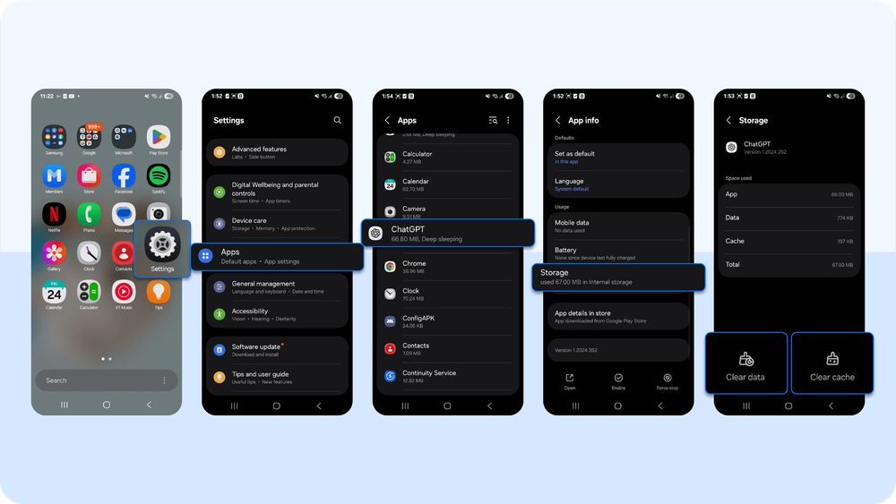 - Android: Go to Settings > Apps > [Select App] > Storage and cache > Clear cache > Clear storage > Uninstall >. This process removes Pegasus spyware and ensures you reinstall a clean, verified version of the app.